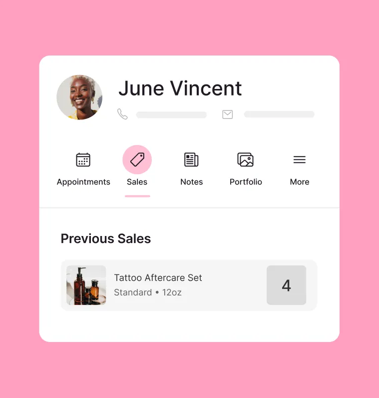 Product quantities auto-update after each sale. Purchases are saved to each client profile so you can keep track of their preferences.