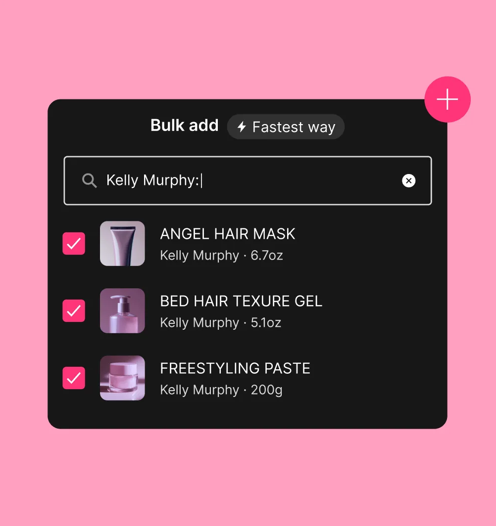 Quickly add multiple products—no spreadsheets or manual entry needed. As you search, GlossGenius recommends top products and brands based on your order history and what's trending.