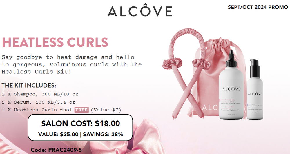 Kit Includes: 1– Volumizing Shampoo 2oz 1– Serum 3.4oz 1– Heatless Curls Rod and Scrunchie Set Salon Cost: $18.00 Total V