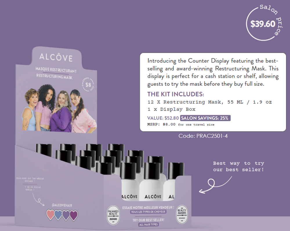 Kit Includes: 12 - Restructuring Mask 2oz Salon Cost: $39.60 Total Value: $52.80 Savings: 25%