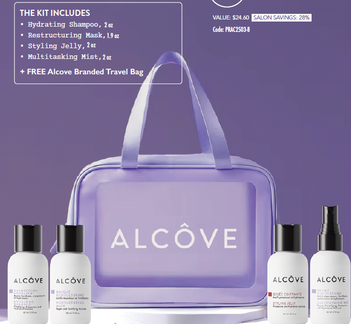Travel Time Prepack Kit Includes: 1 - Hydrating Shampoo 2oz 1 - Restructuring Mask 2oz 1 - Multitasking Mist 2oz 1 - Styling Jelly 2oz 1 - Alcôve Branded Travel Bag