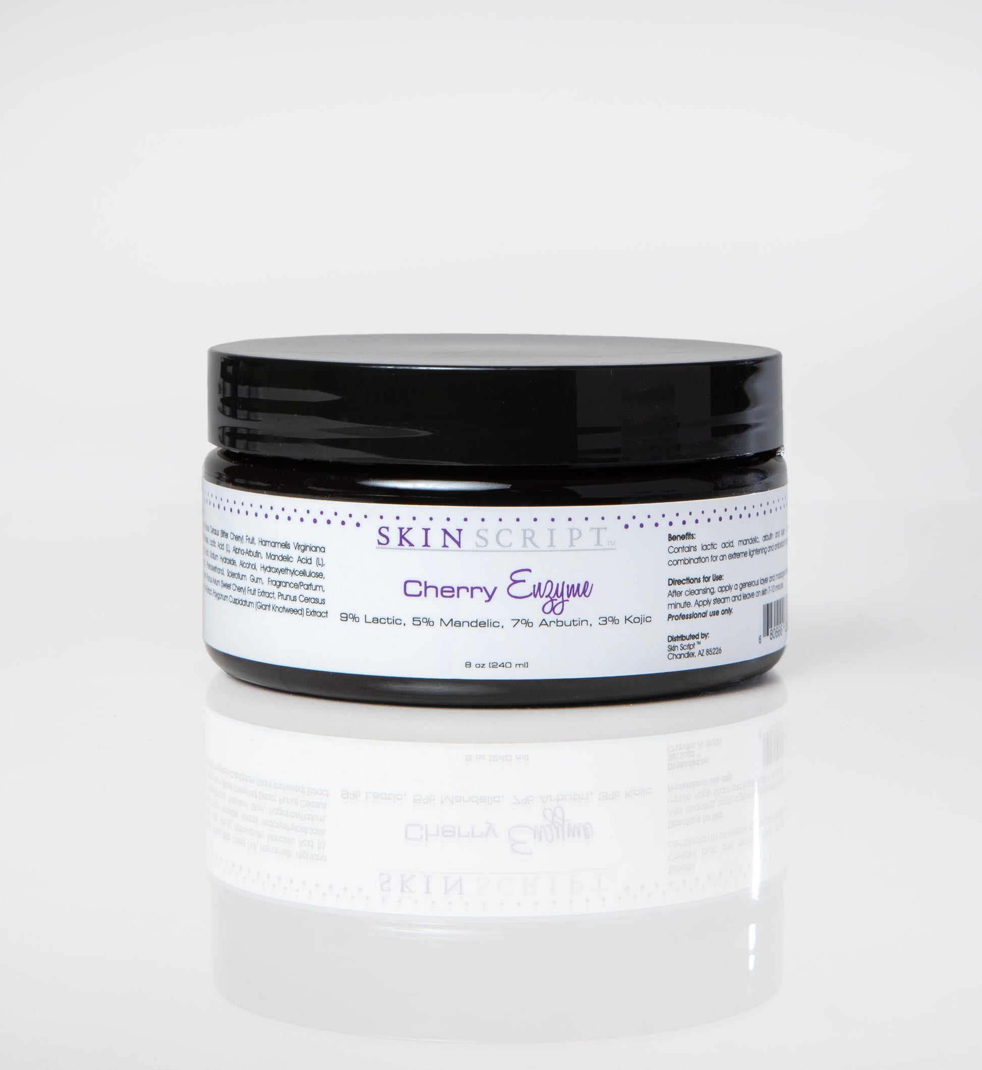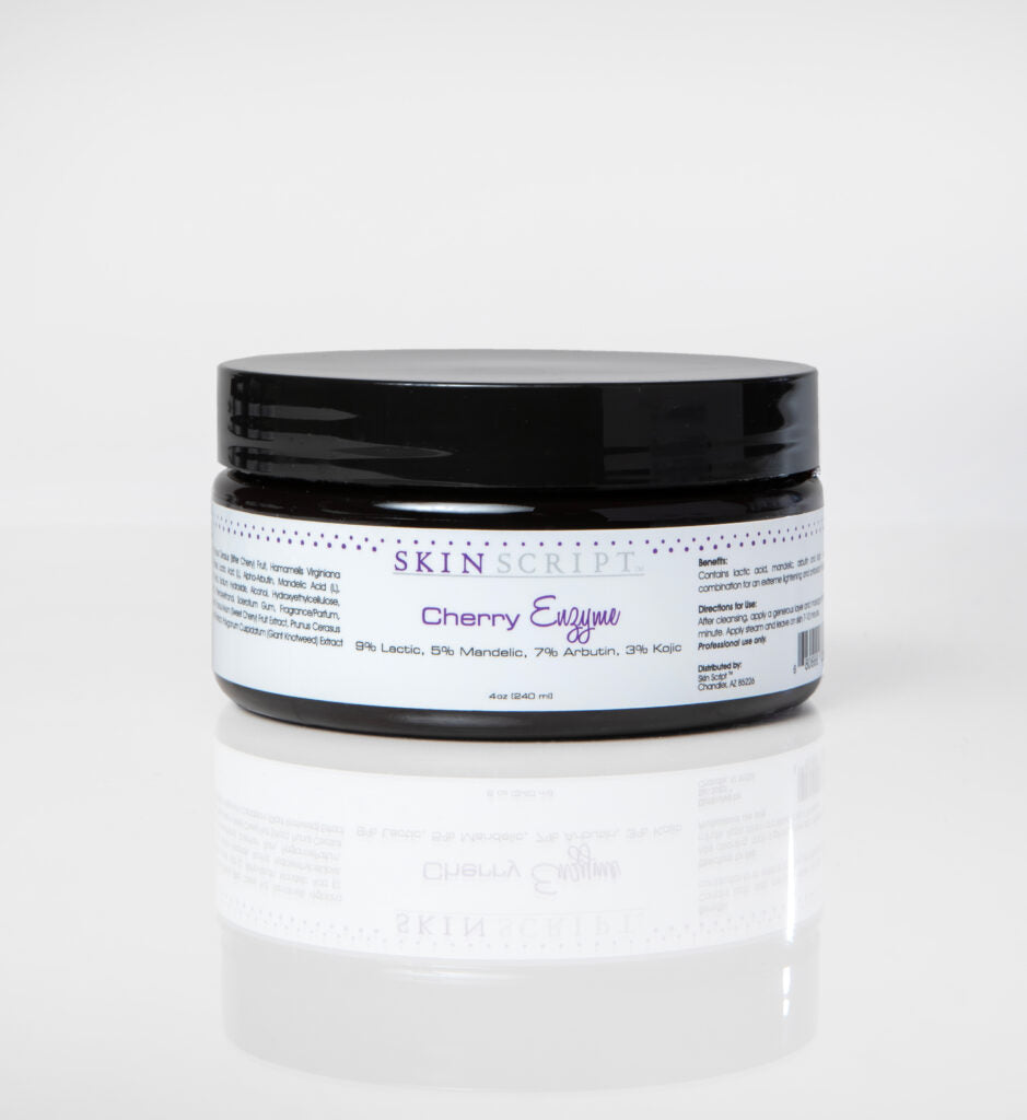 Professional Use Only. The Cherry Enzyme’s star is the bitter tart cherry puree which is an antioxidant, anti-inflammatory and promotes nourished, luminous skin. This enzyme contains 9% lactic acid, 5% mandelic acid, 7% arbutin and 3% kojic. It promotes deep hydration that protects from environmental damage while relieving the surface signs of aging.