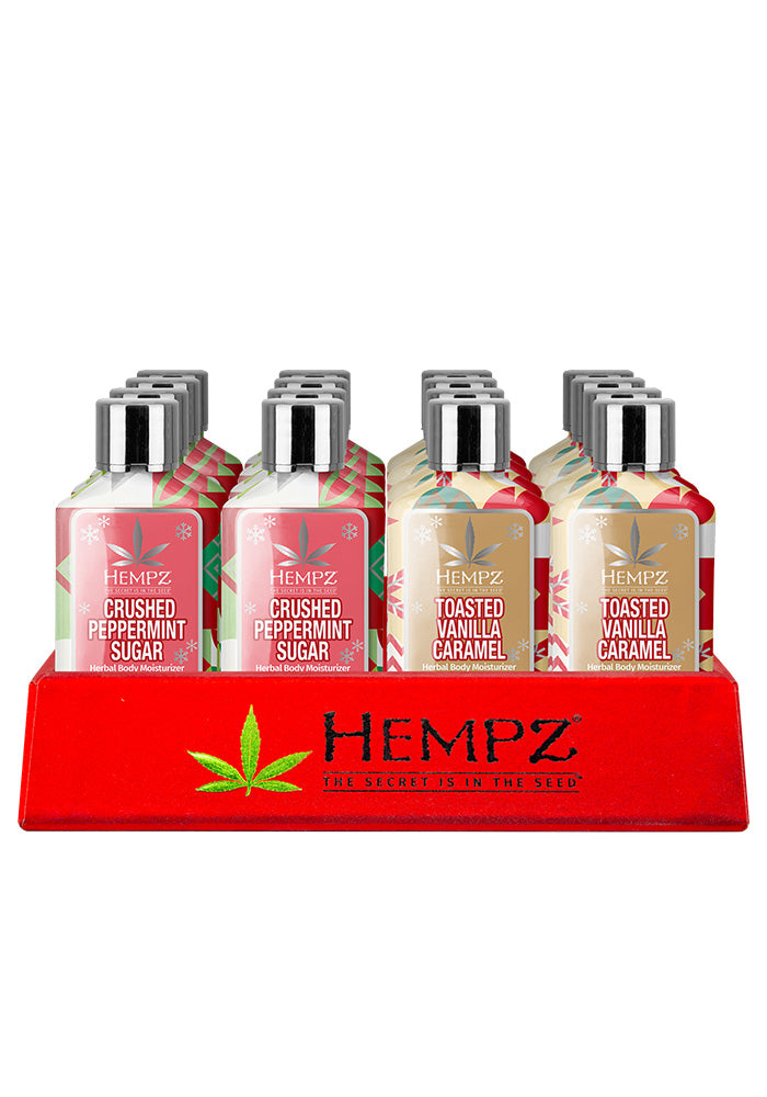Promotion Includes: - 12 Limited Edition Mini Crushed Peppermint Sugar Herbal Body Moisturizer 2.25 fl oz - 12 Limited Edition Mini Toasted Vanilla Caramel Herbal Body Moisturizer 2.25 fl oz - FREE Merchandising Basket