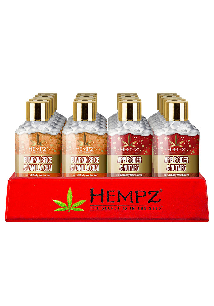 Promotion Includes: - 12 Limited Edition Mini Pumpkin Spice & Vanilla Chai Herbal Body Moisturizer 2.25 fl oz - 12 Limited Edition Mini Apple Cider & Nutmeg Herbal Body Moisturizer 2.25 fl oz - FREE Merchandising Basket