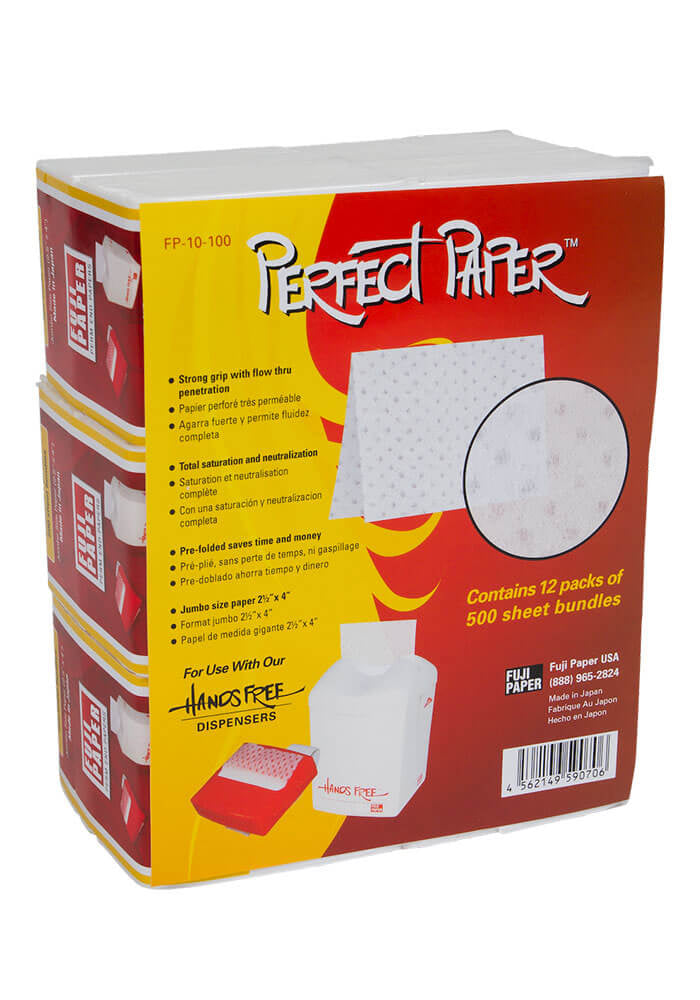CHOICE OF THE BEST AND BUSIEST PERMANENT HAIR ARTIST! Fuji Perfect End Papers are the best endpapers for perms and body waves. The strength of the sheets surpass all others. With a strong grip and flow through penetration, Fuji Perm End Papers have total saturation and neutralization when doing perms. Each paper is pre-folded which saves you time and money. No more waste and hassle of picking up each paper individually. These perm papers can be easily dispensed from any Fuji Hands-Free Dispenser. Perfect Paper perm endpapers are made in Japan.