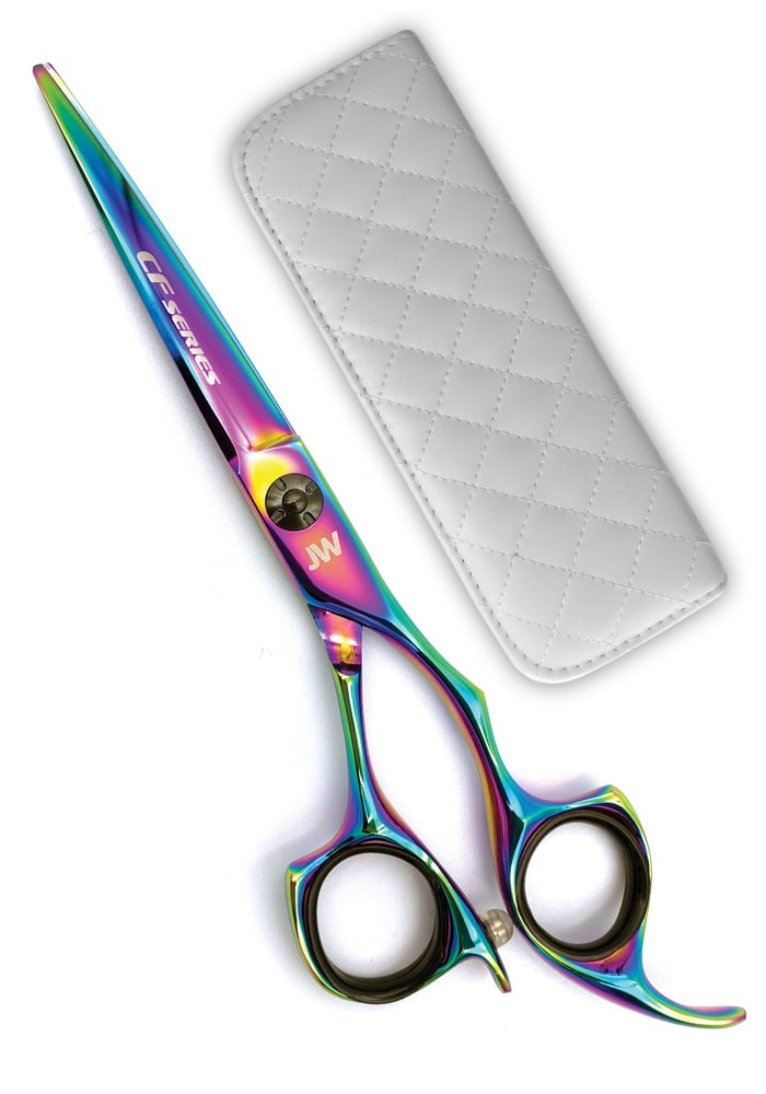 An ergonomic friendly handle design shear finished in rainbow titanium coating.