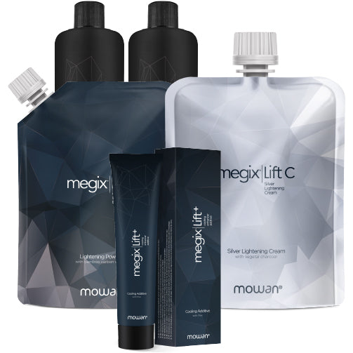 1 each of Lift 9 bleach 17.64 oz, LiftC cream bleach 17.64 oz, Lift+ brunette 5.29 oz, Lift+ blonde 5.29 oz, and a Megix10 blonding system brochure. Plus 2 developers (21 vol and 32 vol).