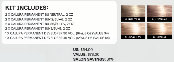 Kit Includes: 2 - Calura Permanent 8 Ultra or 8+ Neutral 2oz 2 - Calura Permanent 8 Ultra or 8+ 3/ 8+G 2oz 2 - Calura Permanent 8 Ultra or 8+ 12/8+AI 2oz 2 - Calura Permanent 8 Ultra or 8+ 36/ 8+GV 2oz 1 - Calura Permanent Developer 20V 8oz 1 - Calura Per