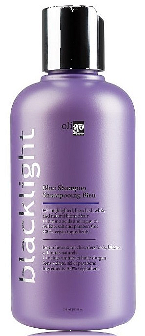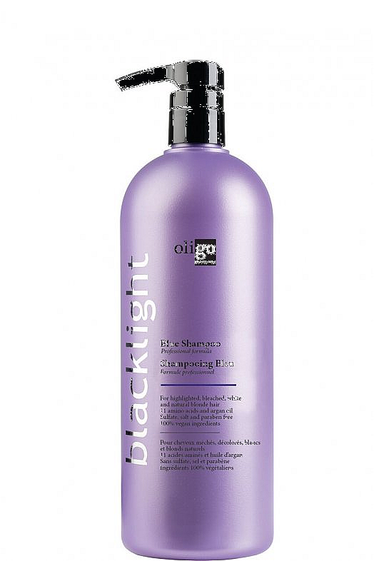 Blacklight's Blue Shampoo, formulated for highlighted, bleached, white and natural blonde hair, eliminates brassiness and refreshes faded highlights leaving hair looking cleaner and brighter. Its unique formula, enriched with 11 amino acids and argan o