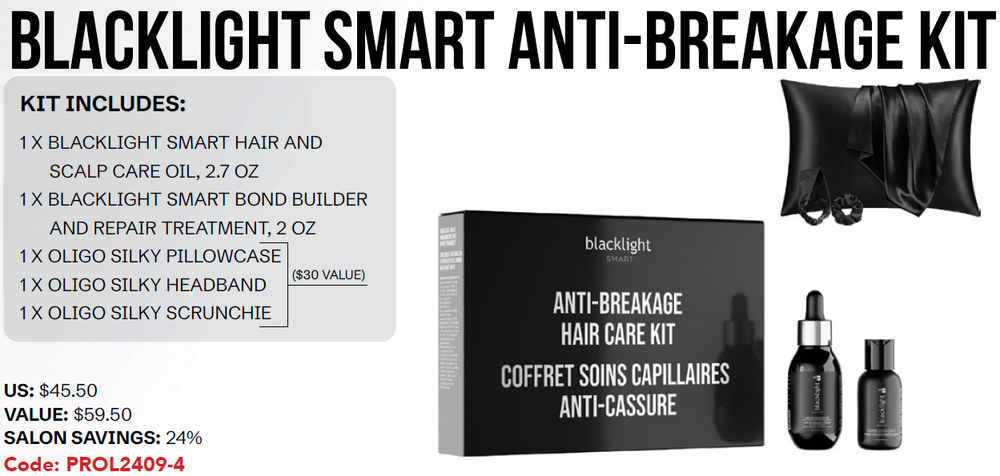 Kit Includes: Blacklight Smart Hair + Scalp Care Oil 2.7oz Blacklight Smart Bond Builder and Repair Treatment 2oz Hair Silk Beauty Set Kit Includes: Silky Pillowcase Silky Headband Silky