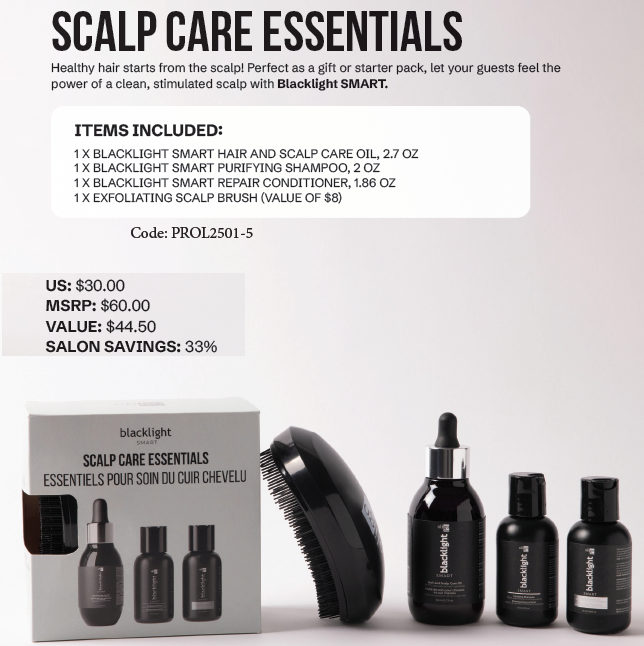 Kit Includes: Blacklight Smart Hair + Scalp Care Oil 2.7oz Blacklight Smart Purifying Shampoo 2oz Blacklight Smart Repair Conditioner 2oz Exfoliating Scalp Brush