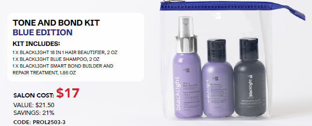 Kit Includes: Blacklight Blue Shampoo 2oz Blacklight Smart Bond Builder & Repair Treatment 2oz Blacklight 18 in 1 Hair Beautifier 2oz Salon Cost: