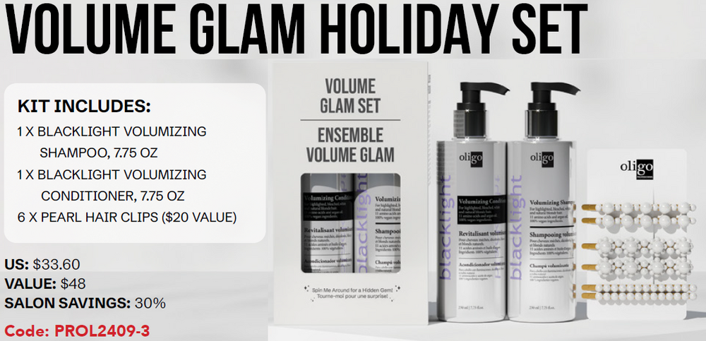 Kit Includes: Blacklight Volumizing Shampoo. 8.5oz Blacklight Volumizing Conditioner. 8.5oz Pearl Hair Clips Salon Cost: $33.60