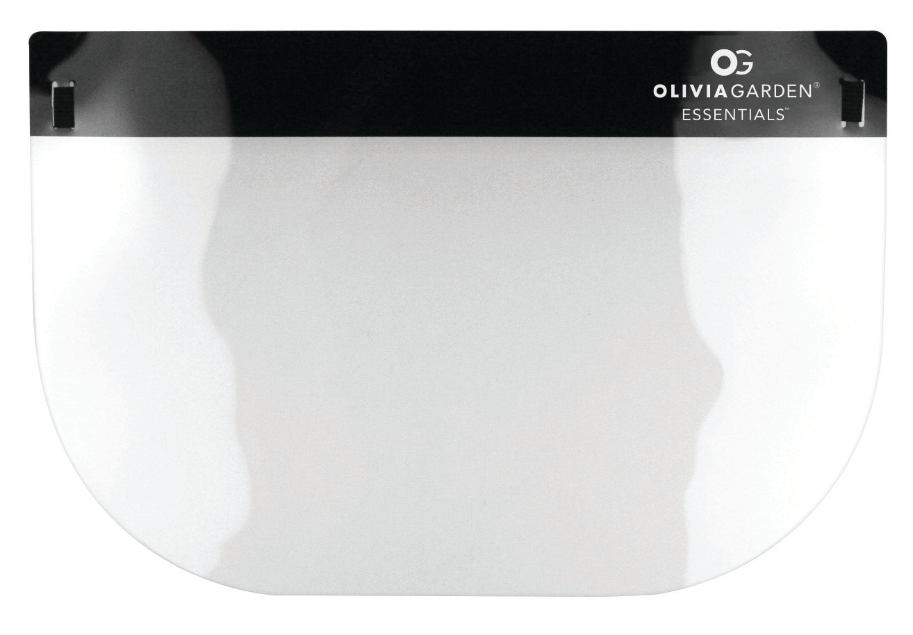 Protective face sheild. Reusable. Custom black band design. Elastic headband with adjustable buckle. Black color foam & elastic maintain a clean look & hide stains. Comes with protective film (on both sides) to be removed after purchase. One size fits all - 8 5/8" x 13" (22cm x 33cm). Anti fog clear shield.
