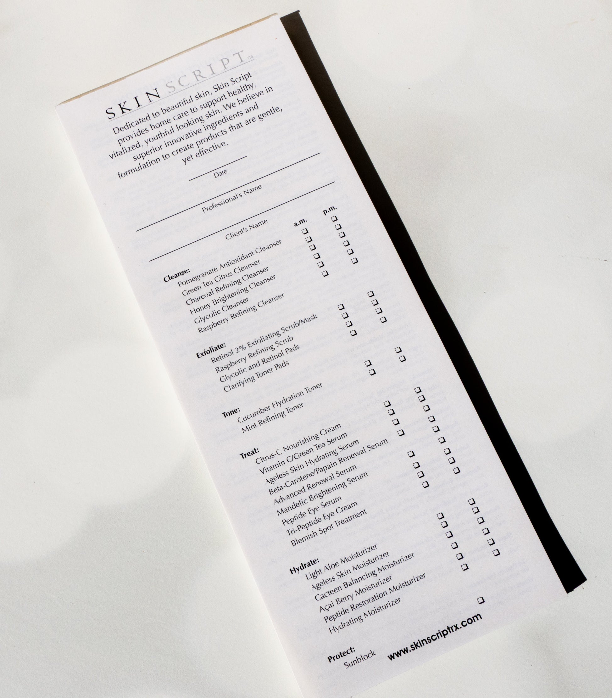 The Skin Script Prescription Pad is the perfect tool for you to recommend retail products and outline customized home care routines. With space to list cleansers, serums, moisturizers, SPF, and treatment notes, this professional tool helps reinforce client education and retail sales.