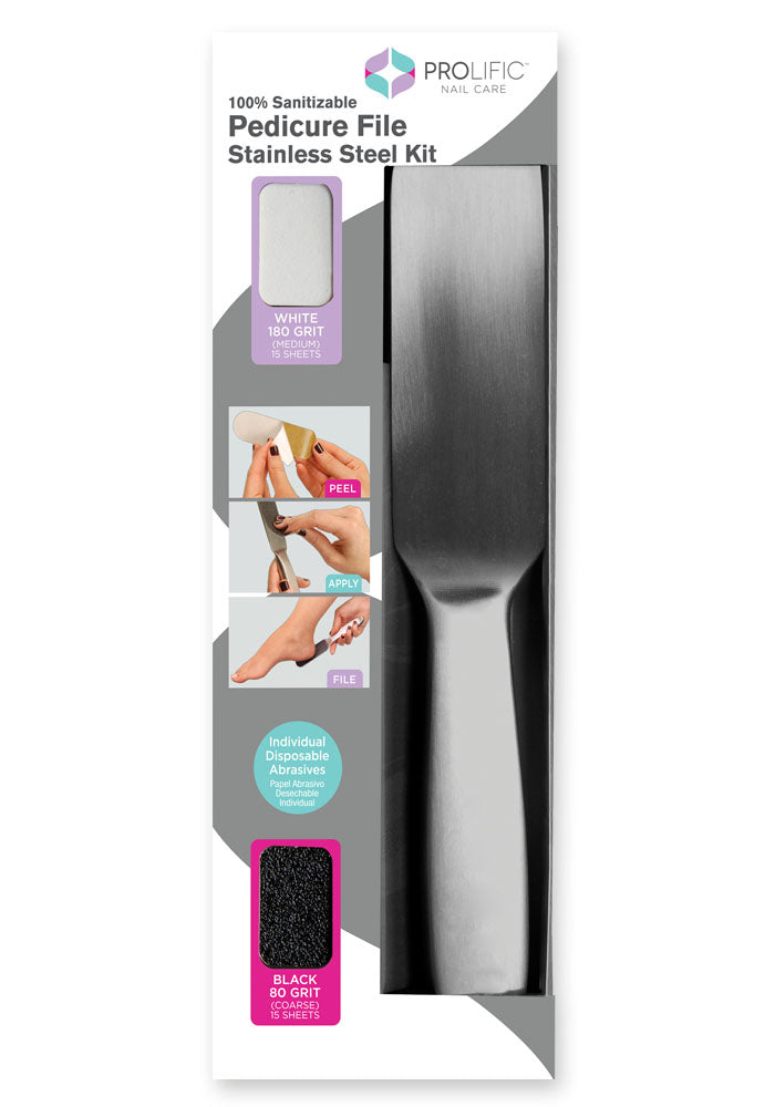 This kit was created with an ergonomic handle to provide a firm grip and leverage while filing. This kit comes with disposable water resistant pedicure abrasive papers.