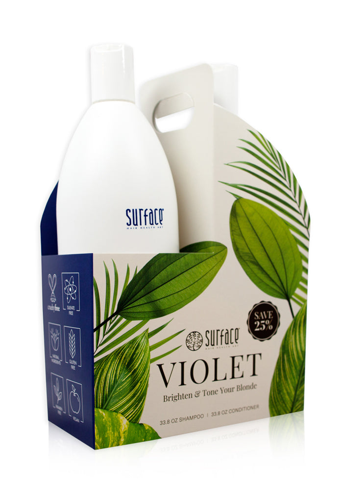 Long Live The Blonde! Tone away brassy, yellow hues from blonde hair and brighten grey hair! This sulfate free purple shampoo and rich conditioner tones, brightens and adds life to dull hair. Deep purple Maqui Berry, Babassu Oil and Moringa Oil create the perfect tinted base to counteract brassy tones from hair. Beyond toning away unwanted yellow tones this Violet Duo nourishes, adds shine and protects hair from free radical damage.
