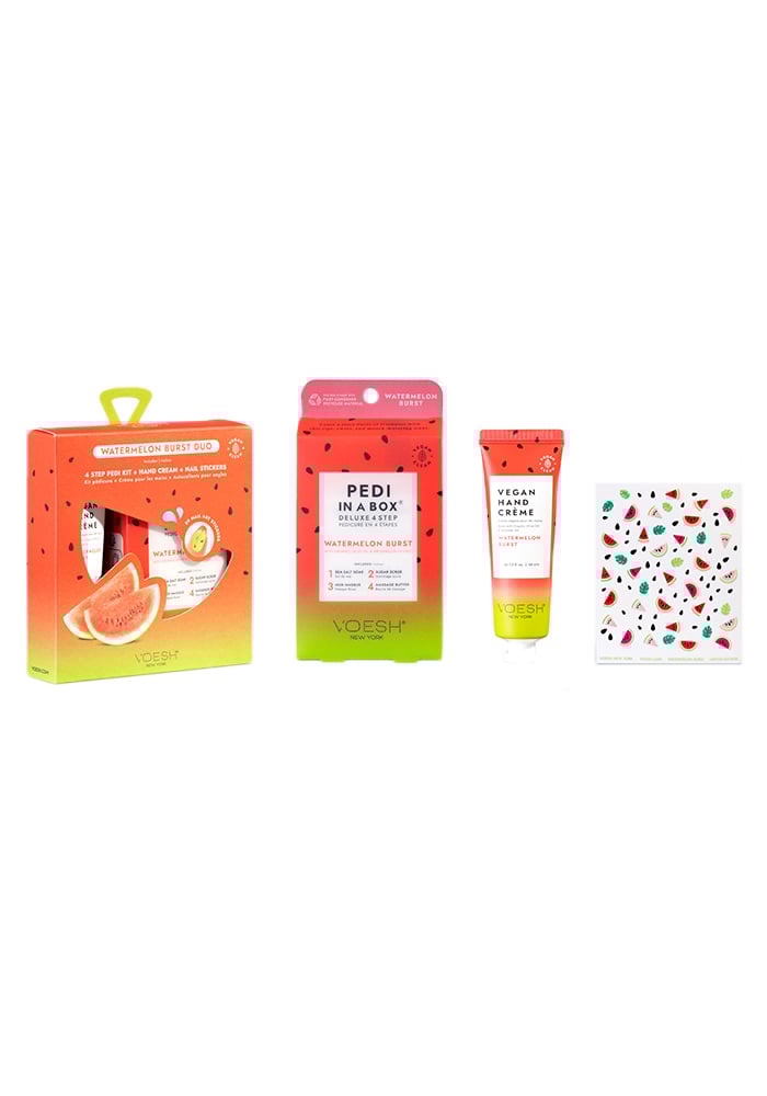 Splash into summer with our Watermelon Burst Duo, featuring our juicy, watermelon-inspired scent! Our Watermelon Burst Duo includes our Pedi in a Box Deluxe 4 Step Watermelon Burst, matching Vegan Hand & Body Crème, and Watermelon Nail Stickers that will leave you feeling fresh and fruity all season long.